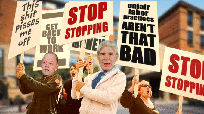 WESTWOOD — This past week, UCLA administration has bravely taken to the streets to protest the injustices committed by the “pesky” AFSCME labor union. “It’s not fair how they keep asking to be paid. We need to stand up against the wrongdoings of – I mean to – the upper class!” said lead organizer Chancellor Julio Frenk during a furious rant about having to eat DeNeve out of a paper box. “Among our list of reasonable demands is for AFSCME members to promise to work overtime on weekends and holidays, and to change their name to a shorter acronym that rolls off the tongue.” At press time, the administration had called the cops on themselves.